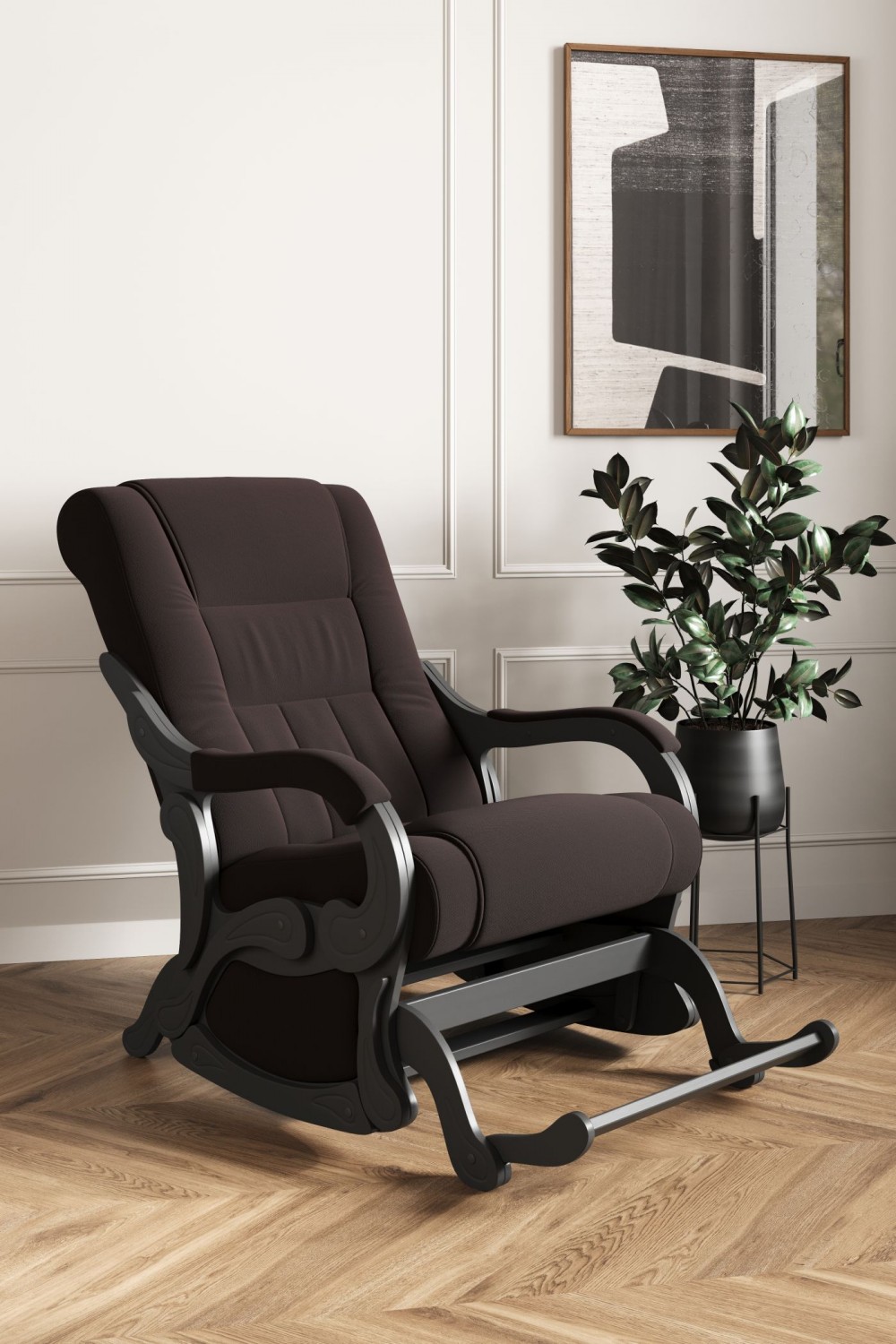 Для комфортного отдыха имеет маятниковый механизм , который выполняет классическую функцию покачивания, при этом она не оставляет вмятин на напольном покрытие. Кресло обтянуто искусственной кожей, смотрится современно и стильно, каркас-дерево, боковины выполнены в виде криволинейных деталей, образующих ножки-опоры, материал боковины фанера. На боковинах имеются мягкие подлокотники.