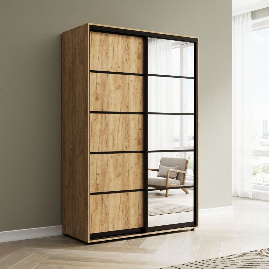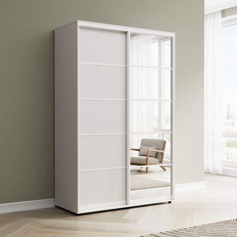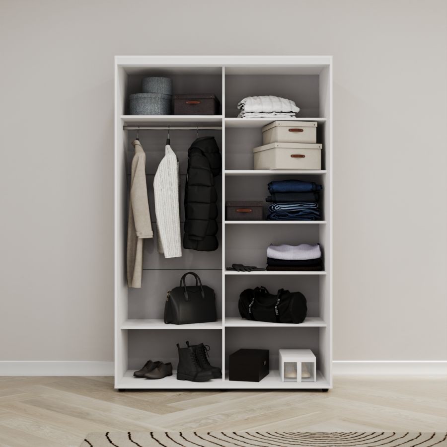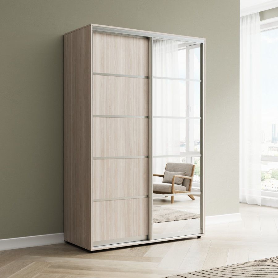 Корпус: ЛДСП класса Е1 толщиной 16 мм, внутреннее наполнение: семь полок и одна штанга. Двери: ЛДСП класса Е1 толщиной 10 мм, зеркало "Серебро" на травмобезопасной пленке.