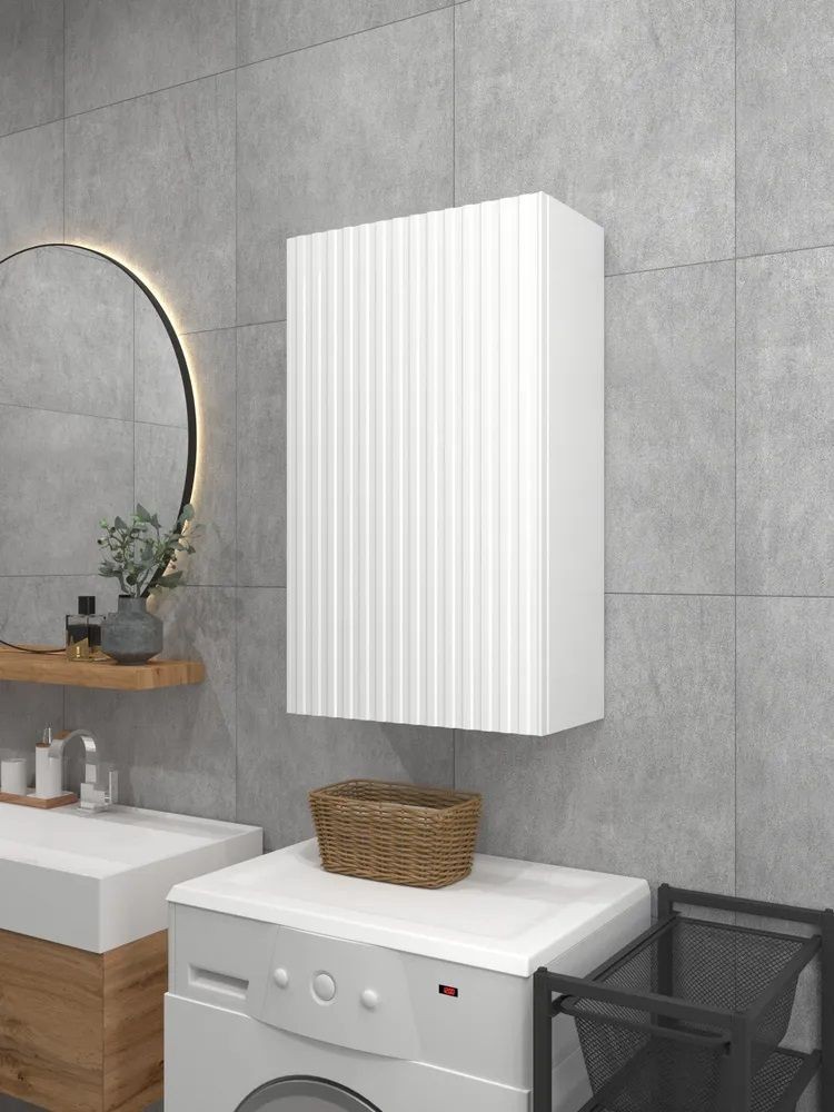 Белый шкаф с рифлёным фасадом будет отлично и стильно смотреться как в ванной, так и в туалете.